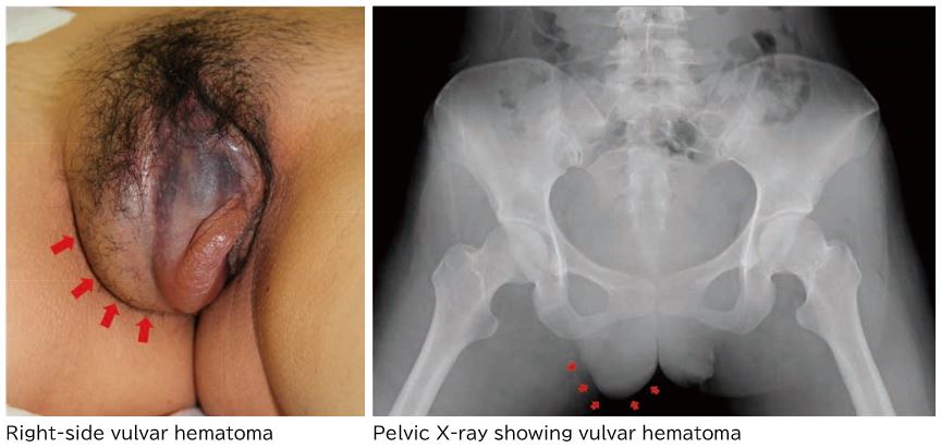 - 症状:右側の大陰唇がが膨張し、明らかな斑状出血と紫斑状の変色を呈していた。腫脹した右外陰部組織の下部は肉眼的に浮腫を呈し、一部は裂傷し出血。