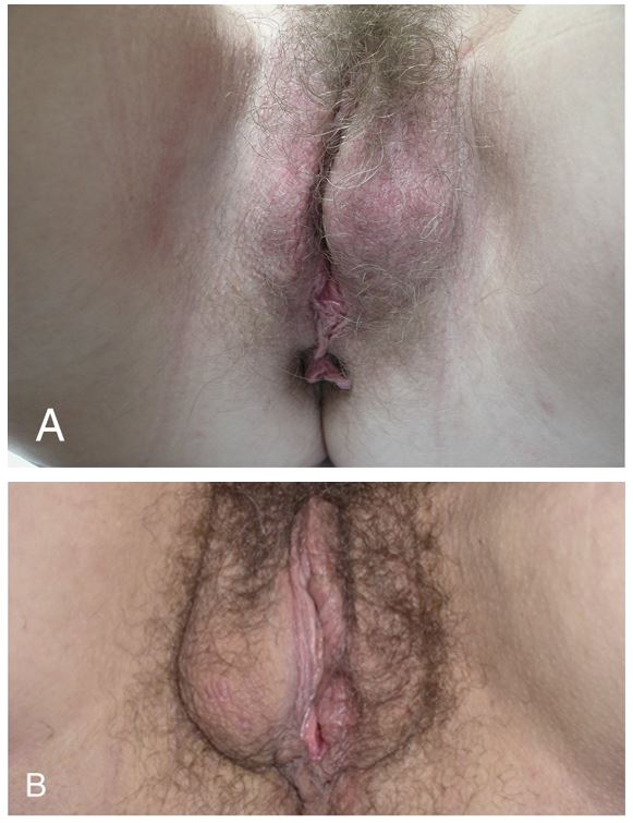 - 症例3:56歳女性、サイクリング週300-450km x 4年、右大陰唇の腫れ(1年)・苔癬化・毛包炎、患者が手術を拒否で症状継続中(Figure 20-B)